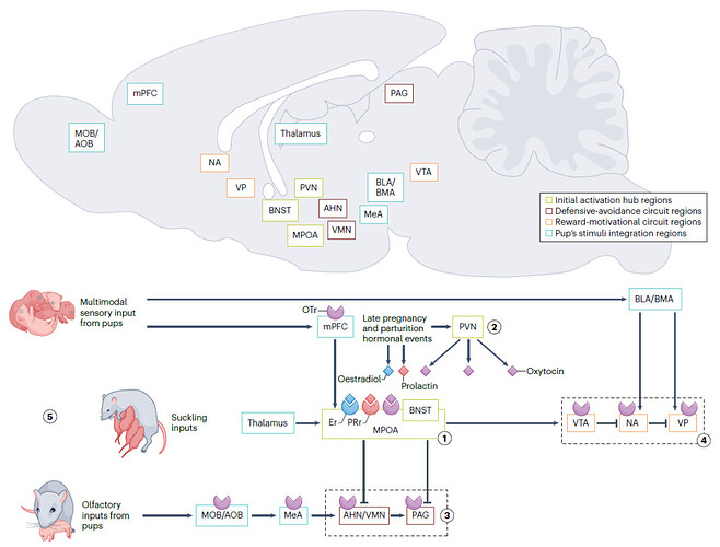 上图:鼠脑矢状切面,显示构成母性回路的主要区域。作为电路初始枢纽的区域用绿色表示。奖励动机和防御回避子回路的区域分别用橙色和栗色表示。接收幼崽感官输入的区域用蓝色表示。下图:啮齿类动物母性回路的示意图,包括上图的大脑区域,以及孕晚期和分娩激素的受体和激活受体:雌二醇(蓝色)、催乳素(红色)和催产素(紫色)。值得注意的是,除了MPOA外,雌激素-催乳素受体也在其他脑区表达。