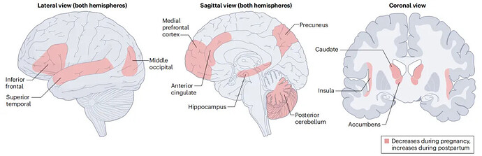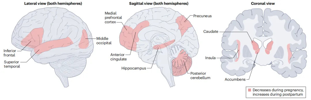 几十年来,成为母亲这一改变人生的事件一直不在磁共振研究的范围之内。第一个描述与怀孕有关的广泛而明显的神经解剖学变化的对照神经成像研究仅在几年前发表。”我们首先总结了第一项研究的主要发现,以及随后的努力,以了解人类怀孕和产后期间大脑发生了什么。怀孕会导致母亲大脑结构的变化。与未分娩的妇女相比,首次分娩的母亲在怀孕前和分娩后2-3个月的评估中显示出广泛的灰质脑容量减少。与怀孕相关的大脑减少是显著的,总皮质灰质体积平均减少3%”。这种灰质体积减少主要位于中线区域(从内侧前额叶皮层(mPFC)延伸到前扣带皮层,从楔前叶皮层延伸到后扣带皮层)、外侧前额叶皮层(主要是额叶中下回)、上颞叶皮层和中颞叶皮层(延伸到脑岛,梭状回和颞顶叶交界处)。灰质减少也会影响皮层下区域,如海马体(和海马旁回)、腹侧纹状体(包含伏隔核的皮层下区域)和背侧纹状体,特别是尾状核。
