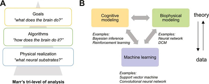 (A)有影响力的Marr的三重分析为计算精神病学奠定了理论基础,它提出,要研究大脑,人们必须考虑多个层次的解释,包括目标(“为什么”),算法表示(“如何”),最后是物理实现(例如,神经基质,“在哪里”)。(B)认知模型,如贝叶斯和强化学习,生物物理模型,如动态因果模型(DCM),以及机器学习模型,如支持向量机或深度学习,构成了神经精神病学研究中常用的3个主要模型类别。