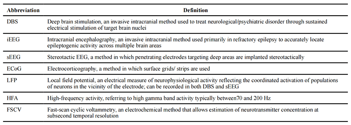 使用侵入性的方法可以记录几种不同类型的神经活动。DBS手术可能允许进行LFP、单单元和快速扫描循环伏安法(FSCV)记录,而iEEG手术目前允许进行LFP和单个单元记录。