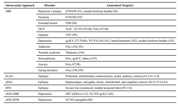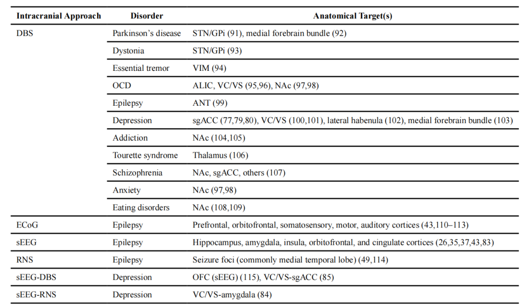本表概述了目前用于治疗神经和精神疾病的颅内干预措施,包括最常见的解剖靶点。