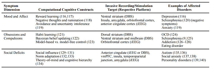 算法目标的概念并不限制在解剖上限制或功能上分离的大脑区域。相反,它还允许针对区域之间的功能连接或整合。这源于所有算法都需要消息传递,而消息传递则意味着连通性。由此可见,算法的目标可能是支持大脑中分布式处理的连接。精神疾病中的连接障碍可以从韦尼克分离假说精神下的白质束中断和白质营养不良,到一系列突触病变(如精神分裂症、帕金森病)所暗示的功能解体或连接障碍。在这种情况下,多区域、多电极平台(如sEEG)变得至关重要,因为机会将通过电路和网络级的记录和刺激而出现。这与目前的精神病学DBS方法形成了对比,后者几乎完全是单一的目标(表2)。方便,精神并发症如抑郁症非常高患者接受sEGG,终生患病率30%到35%的人口研究癫痫患者,甚至更高的利率(w50%-55%)的患者在三级中心。这提供了一个很好的机会来检查算法目标使用全电路记录来解决精神相关的问题。
