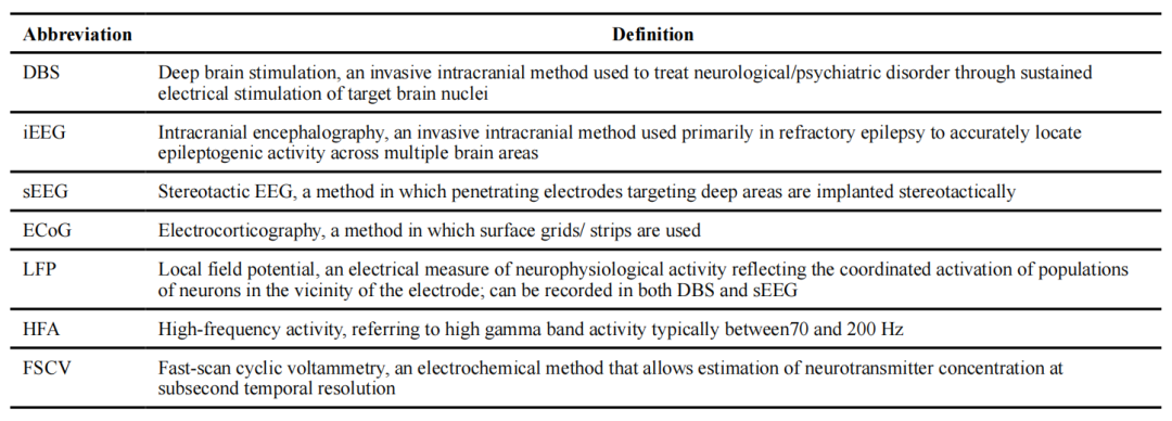 最近神经科学研究的一个特别富有成果的路线来自于人类颅内研究,它利用了功能性神经外科干预。在这些过程中,患者被植入具有高解剖精度的电极,以允许电生理监测和/或靶向对受损脑区域的电刺激。这些记录与功能磁共振成像等无创神经成像技术相比,具有主要优势。具体来说,颅内信号提供了神经元活动的直接读出,具有优越的空间(毫米)和时间(亚毫秒)分辨率和更高的信噪比,并且更容易在生物学上解释。在这里,我们讨论了最常用的颅内方法(深部脑刺激DBS和颅内脑电图iEEG)(术语表见表1,每种方法的解剖目标和患者群体见表2)。也存在其他侵入性干预措施,但他们的在人类神经科学中的应用仍在很大程度上未被探索,并且超出了本综述的范围。