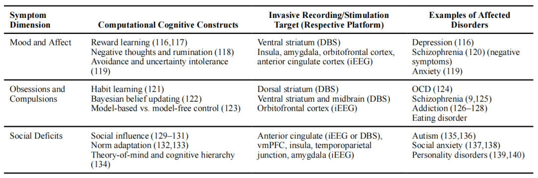 因为大多数精神症状都是经诊断的,在这里,我们列出了特定症状维度、计算定义的结构和相关的大脑区域/回路之间的初步映射,这些区域可以通过人类颅内记录或刺激来定位。随着计算精神病学和人类颅内研究的发展,我们对这些映射的知识将继续发生变化。DBS,脑深部刺激;vmPFC,腹内侧前额叶皮层。