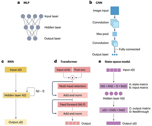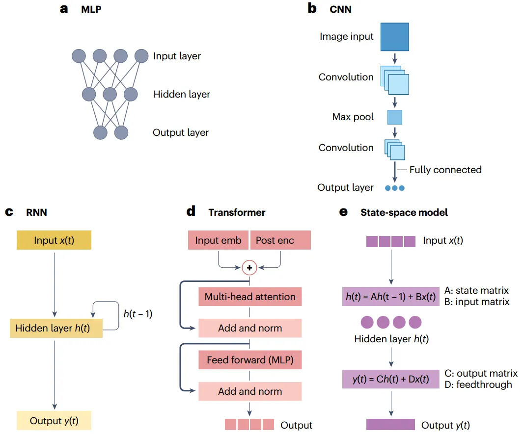 深度学习的革命性在于 “端到端学习”:编码器与解码器均为可训练组件,无需人工设计特征,能自动提取从局部到全局的层级特征。常用架构各有适配场景:多层感知机(MLP)擅长非线性映射、卷积神经网络(CNN)适配图像类数据、循环神经网络(RNN)捕捉时序依赖、Transformer 通过自注意力机制处理长序列、状态空间模型高效应对超长时序数据。这些架构均为 “通用逼近器”,只要数据与参数充足,即可学习复杂的神经 - 行为映射关系。