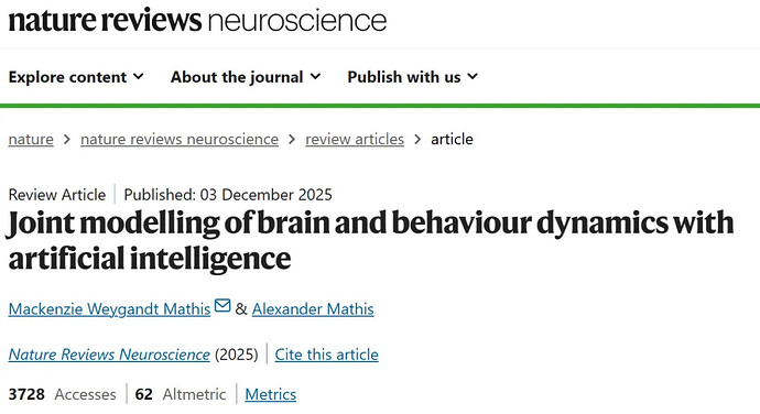 Mathis MW, Mathis A. Joint modelling of brain and behaviour dynamics with artificial intelligence. Nat Rev Neurosci. 2025 Dec 3. doi: 10.1038/s41583-025-00996-1. Epub ahead of print. PMID: 41339709.