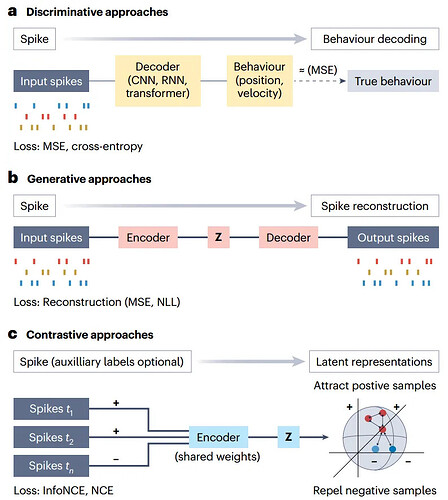 - 代表工具: CEBRA(基于 InfoNCE 损失的时序对比模型),可通过时间邻近性或辅助标签定义正负样本。