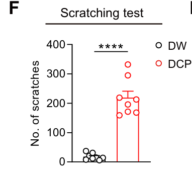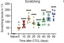 有趣的是,在肿瘤生长开始之前,我们观察到了瘙痒的早期发作:明显的抓挠行为从第 5 天开始(~50 次抓挠/小时),并在第 20 天达到顶峰(>100 次抓挠/小时)(图 1B)。值得注意的是,在晚期(CTCL 第 40-60 天),瘙痒持续处于高水平(>100 次抓挠/小时),突出了慢性瘙痒的存在(图 1B)。
