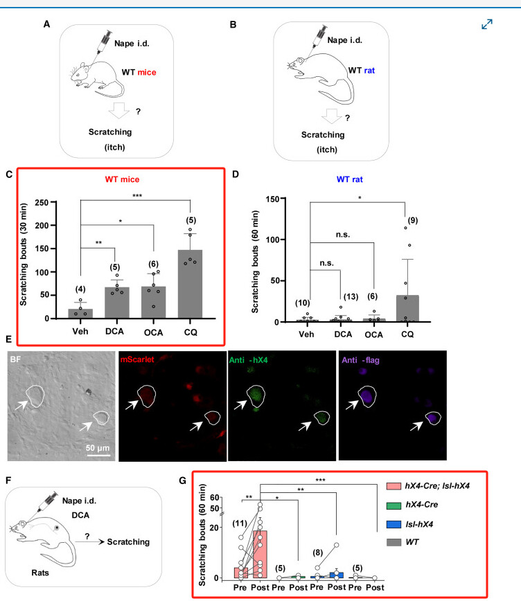 在当代瘙痒研究中,抓挠往往是了解瘙痒感的唯一窗口,因此被用作评估瘙痒增加或减少的关键、客观行为指标,通常仅基于抓挠发生率或抓挠次数。然而,在常用的瘙痒模型(如组胺、氯喹(CQ)或血清素(5-羟色胺[5-HT])中,抓挠频率/强度/质量的任何变化情况尚不清楚,尽管这些化合物通过独立的机制起作用,并且在某些情况下作用于不同的感觉神经元亚群。