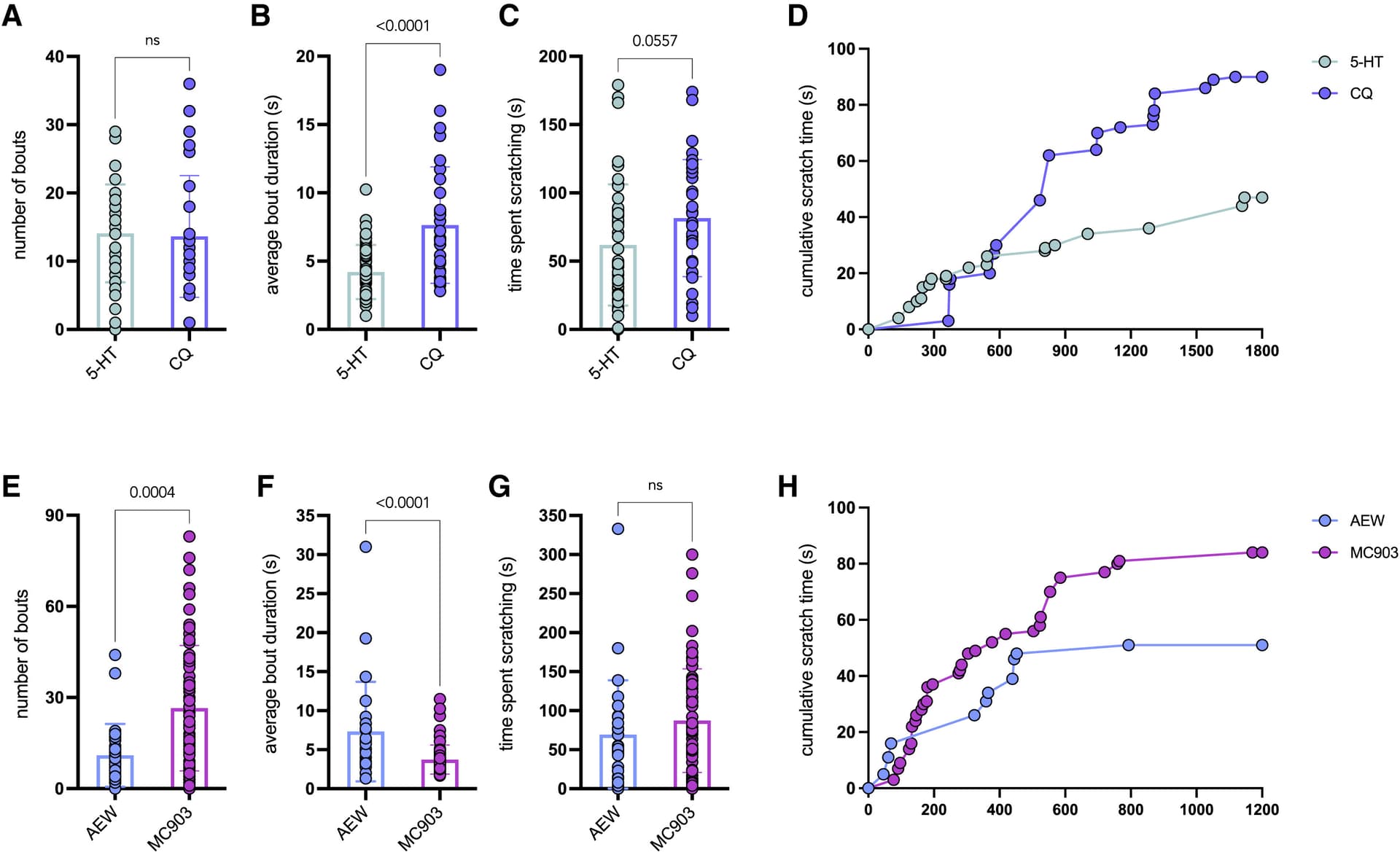 为了说明测量多种瘙痒抓挠参数的重要性,我们重新分析了先前发表的有关急性期和慢性期瘙痒模型中抓挠行为的实验数据。不同模型中的抓挠行为存在定量和定性差异。首先,在急性期瘙痒的面颊模型中,CQ 或 5-HT 注射动物的抓挠总次数没有显著差异(图 2A)。然而,CQ 引起的平均抓挠持续时间显著长于 5-HT,导致 CQ 引起的总抓挠时间更长(图 2B 和 2C)。此外,尽管两种致痒物质引发的抓挠次数相同,但抓挠的时间模式差异很大。例如,5-HT 在注射后 10 分钟内引发许多短时抓挠,并在接下来的 20 分钟内逐渐减少,而 CQ 引发的抓挠时间更长,且在整个 30 分钟的记录期间分布较均匀(图 2D)。此外,与 5-HT 或溶剂相比,CQ 引起的爪子舔舐和咬啮行为增加。 有趣的是,两种瘙痒原都引起了注射部位同侧和异侧的抓挠,而注射溶剂的动物仅表现出少数同侧抓挠行为。