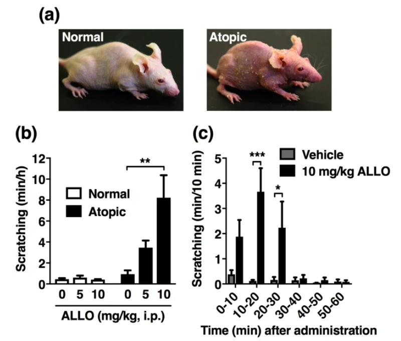 ALLO 的全身给药在特殊饮食喂养的特应性皮炎模型中引起强烈的抓挠,而它不会影响正常小鼠的自发性和瘙痒原诱导的抓挠