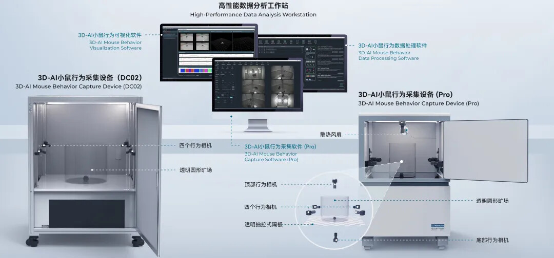 - 3D-AI 动物行为分析系统 :致力于解决传统行为分析的痛点,以高通量、无干扰的精准量化能力,实现对社交、焦虑、抑郁及认知等多种行为的客观解析,大幅提升实验数据的敏感性与可靠性。
