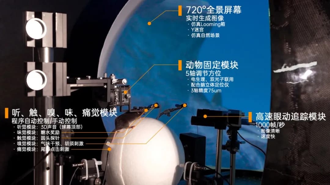 - 动物虚拟现实系统:创造了一个高度可控的沉浸式实验环境,可结合双光子与电生理记录技术,精准解析神经环路功能与复杂行为之间的因果关系,强力支撑认知机制研究与药物开发。