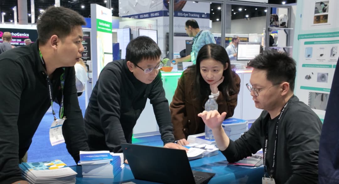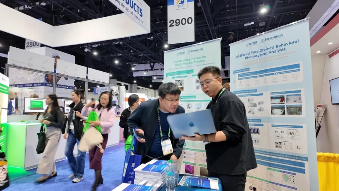 在这次备受瞩目的国际科技盛会上,一湾生命科技团队携自主研发的 BehaviorAtlas 神经学系列产品精彩亮相,集中展示了包括 3D-AI 动物行为分析系统、3D-AI 运动功能分析系统、动物眼动追踪系统以及动物虚拟现实系统在内的多项创新成果。我们不仅呈现了技术的前沿实力,更与来自世界各地的科研工作者展开了深度交流,认真倾听了他们在实际研究中面临的具体挑战。面对如何高效、精准的动物行为表型评估的共性难题,一湾生命科技正积极与多个科研团队展开合作,探索如何利用高精度、智能化的技术方案,助力突破当前的研究瓶颈。