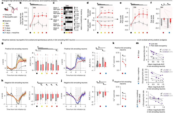 这些 P lick 神经元被进一步细分为阳性(舔舐开始时兴奋)和阴性(舔舐开始时抑制)亚群,这些神经元亚群共同编码疼痛引起的动机性行为(图 2h-j)。吗啡处理并不影响整体神经活动,而是特异性地调节这些特定神经元在疼痛状态下的活动模式 ,破坏维持“疼痛状态”的神经动力学基础,从而发挥镇痛作用(图 2k-p)。