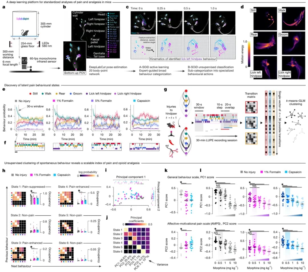 为了解决这一问题,研究团队开发了名为 LUPE (Light Automated Pain Evaluator) 的 AI 驱动行为分析平台。通过底部的高速红外摄像机记录小鼠,利用 DeepLabCut 追踪 20 个身体关键点。随后,结合 A-SOiD(半监督)和 B-SOiD(无监督)算法,将复杂的行为流分割为六种基本行为谱(图 1a-c):静止(Still)、行走(Walk)、直立(Rear)、理毛(Groom)、舔左后爪(Lick left)、舔右后爪(Lick right)。