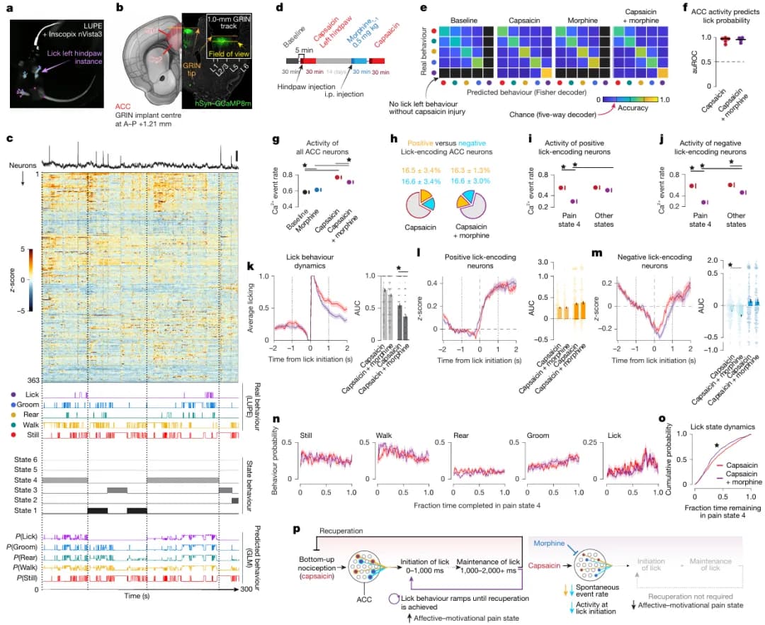 为了将 ACC 活动与吗啡敏感性疼痛行为联系起来,研究团队利用活体钙成像在 LUPE 系统中同步记录小鼠自由活动时的神经元钙信号,通过将神经活动与行为和潜在状态对齐,并拟合广义线性模型(GLM)来预测舔舐概率,识别出了一群特定的神经元——P lick 神经元(图 2a-f)。