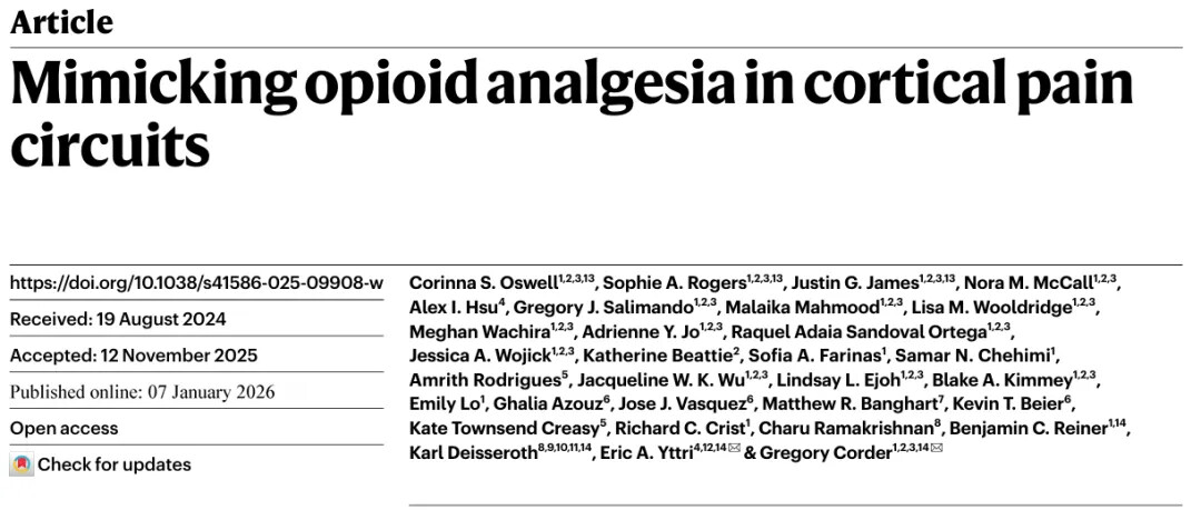 2026 年 1 月 7 日,宾夕法尼亚大学的 Gregory Corder 团队与卡内基梅隆大学的 Eric A. Yttri 团队在 Nature 发表的题为 “ Mimicking opioid analgesia in cortical pain circuits ” 研究论文中揭示:
