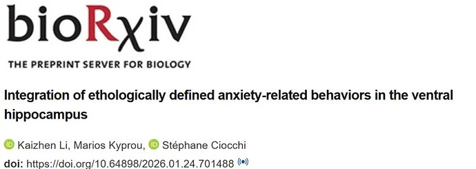 2026 年 1 月 24 日,瑞士伯尔尼大学 Kaizhen Li 与 Stéphane Ciocchi 团队在 BioRxiv 发表题为" Integration of ethologically defined anxiety-related behaviors in the ventral hippocampus" 的预印本研究。研究团队整合 3D 行为追踪、神经元亚群特异性在体钙成像及光遗传学调控技术,系统探究腹侧海马体微电路的焦虑调控机制。 结果证实,腹侧海马体三类神经元存在明确功能特化:PV 中间神经元选择性调控直接威胁暴露相关行为,Sst 中间神经元主导趋近 - 回避冲突决策过程,锥体神经元则泛化编码焦虑相关信息。 该研究为焦虑障碍的精准干预提供了全新的理论依据与潜在靶点。