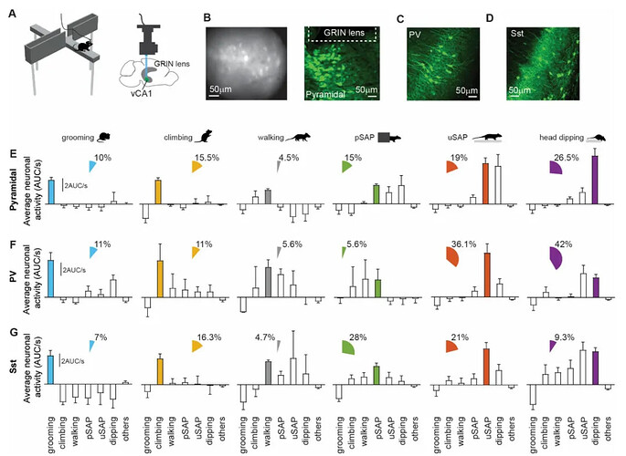 行为的精细化与时空有序性,必然对应着神经环路的特异性调控。为明确腹侧海马体(vH)神经元亚群的激活特征,研究通过梯度折射率(GRIN)透镜结合头戴式微型显微镜,对 vH CA1 区三类核心神经元——锥体神经元、PV中间神经元、Sst 中间神经元,进行特异性在体钙成像记录,精准捕捉其在不同行为中的激活规律(图 3A-D)。