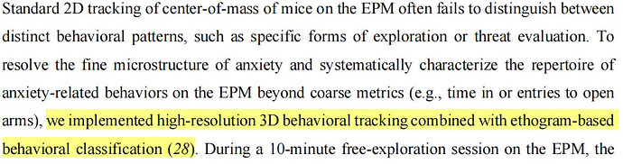 高架十字迷宫(EPM)是评估啮齿动物焦虑样行为的常用工具,其利用动物探索新环境的本能与回避开放、高架且潜在威胁空间的天性之间的冲突。小鼠在 EPM 中会表现出复杂的微行为,反映其在环境中穿梭时的瞬时状态。传统的小鼠重心 2D 追踪往往无法区分不同的行为模式,如特定的探索行为或威胁评估行为。为解析焦虑行为的精细结构,并系统表征 EPM 中除开放臂停留时间、开放臂进入次数等粗略指标外的焦虑相关行为库,本研究采用高分辨率 3D 行为追踪结合基于行为图谱的分类方法。