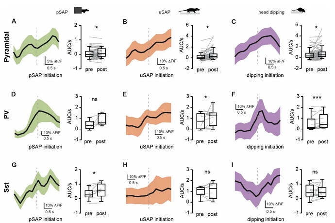 - PV中间神经元: 时间锁定激活具有极强行为特异性——在 uSAP 和探头行为启动后,快速出现钙信号升高, AUC 值显著高于行为启动前(p<0.05),激活速度快、峰值明显,契合其快速周围抑制功能(图 4E-F);而在 pSAP 启动时,无显著时间锁定特征(p>0.05),仅表现出微弱波动的活动(图 4D),进一步印证其仅参与直接威胁响应。