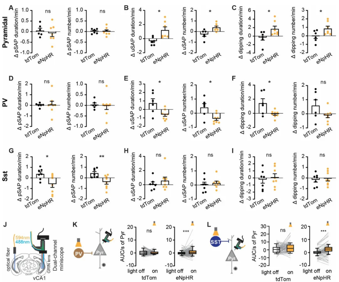 - 沉默 Sst 中间神经元: 表现出高度特异的行为影响——仅显著减少 pSAP 的持续时间和发生频率(p<0.05)(图 5G),对 uSAP 和探头无显著作用(p>0.05)(图 5H-I),且沉默后锥体神经元活性升高 35%(图 5L)。这与 Sst 中间神经元 “通过树突抑制调控锥体神经元活动” 的机制一致,表明 “ SSst 中间神经元-锥体神经元”微电路,是 pSAP 维持的必要条件,通过抑制锥体神经元过度激活,稳定决策边界区的风险评估行为。