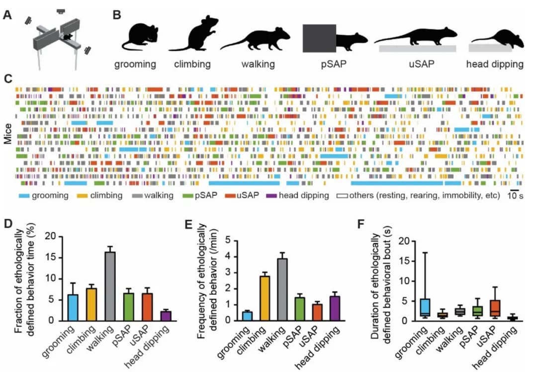 在 10 分钟的 EPM 自由探索过程中,通过三台同步相机以 30Hz 频率记录小鼠行为:一台顶视相机捕捉完整的轨迹,两台水平相机对准开放臂远端,捕捉精细的姿势动态(Fig. 1A)。研究识别出六种主要的符合行为学定义的行为:梳理、行走、攀爬、保护性伸展 - 警觉姿势(protected stretch-attend posture, pSAP)、非保护性伸展 - 警觉姿势(unprotected stretch-attend posture, uSAP)和探头(head dipping)(图 1B,C)。