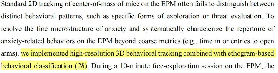 - 方法学突破: 建立 “高分辨率 3D 行为追踪-行为精细化分类-时空特征分析” 一体化研究范式,突破传统焦虑行为评估依赖宏观指标的局限,首次实现焦虑相关行为的生态化、精细化解析,为情绪相关行为量化分析提供新技术框架,让“行为微状态-神经环路” 精准映射成为可能。