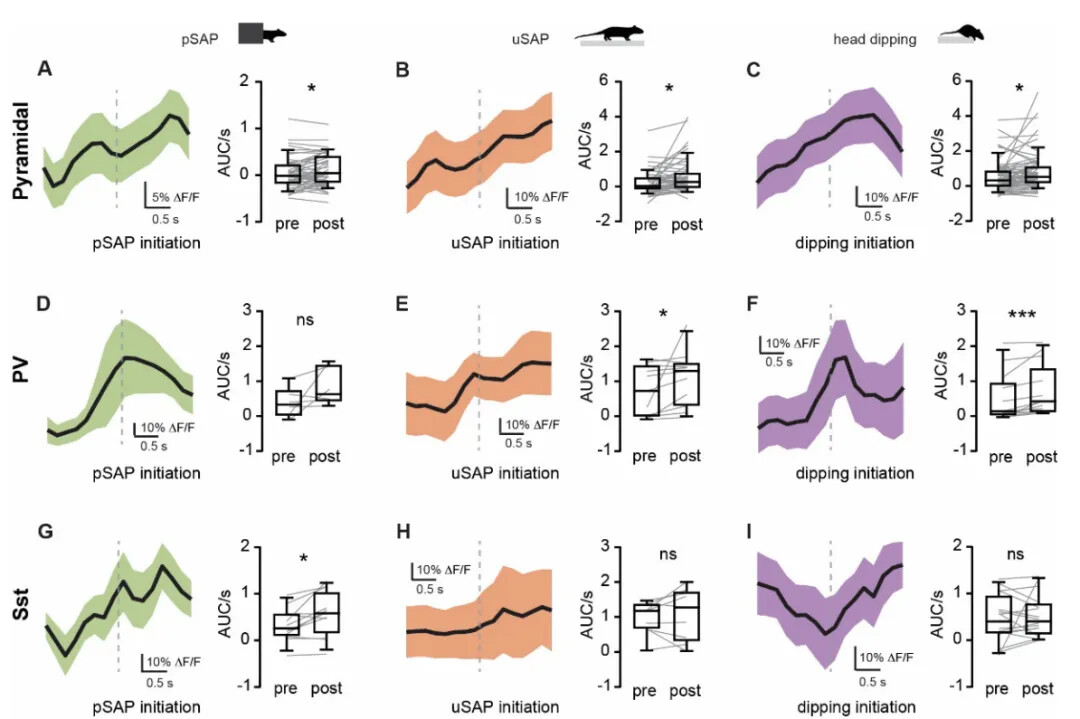 - Sst 中间神经元: 时间锁定激活呈现独特选择性——在 pSAP 启动瞬间,出现明确激活峰值(p<0.01),钙信号迅速升高并维持稳定(图 4G),提示其在 pSAP 启动过程中发挥关键触发作用;而在 uSAP 和探头启动时,无显著时间锁定激活,仅表现为持续缓慢的激活模式(图 4H-I),表明其主要参与这两种行为维持阶段的神经环路调控。