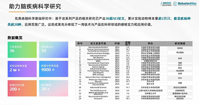 公司核心产品 BehaviorAtlas 神经行为学系列产品已支撑发表 SCI 论文 36 篇,累计分析实验动物样本逾 2 万只,覆盖 20 余种疾病模型。目前,国内外 100 余家科研机构已采用该系列产品构建脑疾病动物模型与行为分析平台,赋能中枢神经系统药物的差异化研发策略(PDD 策略),赋能药物筛选。