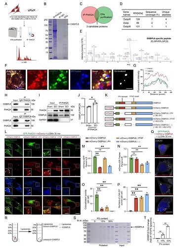 结合 PI4K2A 无直接脂质转运功能、PS 主要在内质网(ER)合成的背景,为明确 PI4K2A 调控溶酶体 PS 的具体途径,本研究通过 ER 分离联合 co-IP-MS 筛选,发现 PI4K2A 与 ER 脂质转运蛋白 OSBPL6 存在特异性相互作用,且该互作在 SCI 后体内模型中进一步增强(图 4B,E,H,I-J)。通过结构域突变体验证,明确 OSBPL6 的 PH 结构域和 FFAT 基序分别介导与 PI4K2A 的结合和与 ER 的锚定,二者缺一不可;同时脂筏共浮选实验证实 OSBPL6 可浓度依赖性结合 PS,并介导其向受损溶酶体膜定向转运(图 4K-Q,R-T)。该结果完整解析了 PI4K2A 调控溶酶体 PS 的分子通路,为溶酶体膜修复提供了核心脂质原料的转运机制。