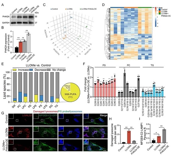 基于溶酶体膜脂质组成是维持其结构稳定性的关键,为解析 PI4K2A 的保护机制,本研究构建 PI4K2A 过表达神经元细胞系,通过脂质组学分析发现,PI4K2A 过表达可显著逆转 LMP 诱导的溶酶体脂质紊乱,核心表现为特异性增加溶酶体中磷脂酰丝氨酸(PS)水平,同时减少多不饱和脂肪酸类甘油三酯(TG)的异常积累(图 3C,D,E,F)。结合 PS 特异性探针共染结果,进一步证实 PI4K2A 通过促进 PS 向溶酶体膜富集实现膜修复(图 3G-I),同时为后续探究 PS 的转运机制提出了新的问题。