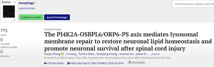 Zhang H, Kang Y, Zhao T, Huang D, Hu X, Di J, Zhang Y, Lu Y, Huang M, Li H, Yao S, Liu B, Rong L. The PI4K2A-OSBPL6/ORP6-PS axis mediates lysosomal membrane repair to restore neuronal lipid homeostasis and promote neuronal survival after spinal cord injury. Autophagy . 2026 Feb 4:1-25. doi: 10.1080/15548627.2026.2619576. Epub ahead of print. PMID: 41556583.