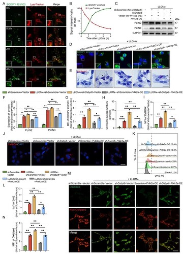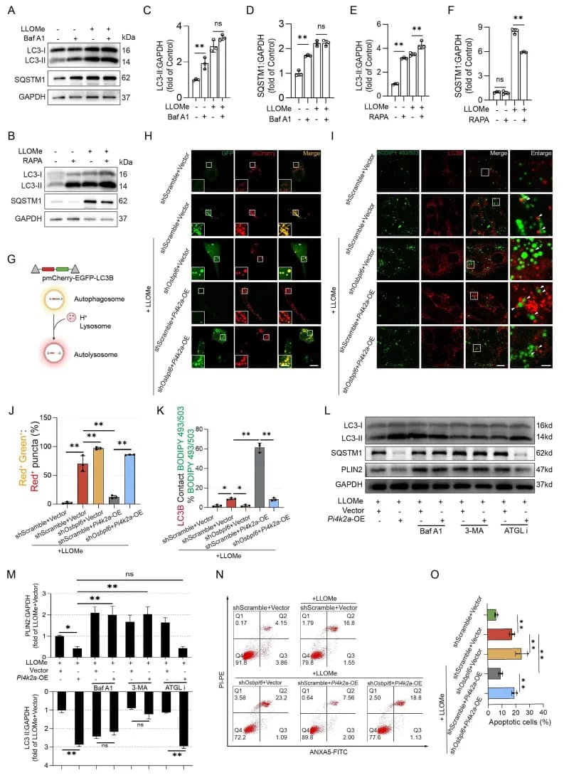 基于自噬流受阻是 SCI 后神经元脂滴积累、功能障碍的重要原因,本研究先证实 LLOMe 可显著阻塞神经元自噬流,而 PI4K2A 过表达可通过 OSBPL6 依赖的方式恢复神经元自噬流(图 6A-F,G-J)。为明确脂滴清除的具体途径,通过自噬与脂解抑制剂的对比实验,证实 PI4K2A-OSBPL6 轴并非通过脂解途径,而是通过激活脂自噬实现脂滴清除(图 6I,K-M)。最终流式细胞术结果证实,OSBPL6 敲低可完全逆转 PI4K2A 过表达的抗凋亡效应 (图 6N-O)。该结果形成完整功能机制链:修复溶酶体→恢复自噬流→激活脂自噬→清除脂滴 / 缓解脂毒性→抑制神经元凋亡。
