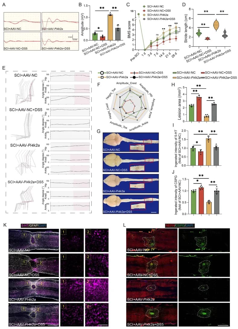脊髓组织大体解剖与免疫荧光染色结果显示,SCI+AAV-Pi4k2a 组小鼠的脊髓损伤灶面积较 SCI+AAV-NC 对照组显著缩小;损伤区域内 5 - 羟色胺(5-HT)能神经元数量明显增加,而胶质瘢痕特征性标志物 CSPG 的表达水平显著降低,提示 PI4K2A-OSBPL6-PS 轴可通过缩小损伤范围、促进功能性神经元存活、抑制胶质瘢痕形成,改善 SCI 后脊髓的病理微环境,为步态功能恢复提供重要的组织学基础。同时,SCI+AAV-Pi4k2a+DS5 组的脊髓损伤灶面积、5-HT 能神经元数量及 CSPG 表达水平,均与 SCI+AAV-NC 对照组无显著差异,证实该通路对脊髓病理微环境的改善作用同样依赖 PS 的合成(图 8G-L)。