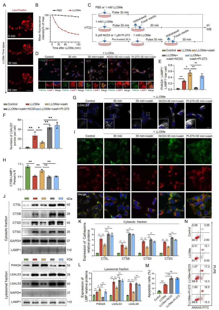 为验证 Fig1 中 PI4K2A 的潜在修复功能,本研究利用 LLOMe 构建体外神经元 LMP 模型,通过两种不同靶点的 PI4K2A 抑制剂干预发现,PI4K2A 功能缺失会显著加剧神经元溶酶体损伤与凋亡(图 2D-L,M,N)。该结果直接证实 PI4K2A 对神经元溶酶体膜完整性具有保护作用,且是抑制 LMP 诱导的神经元凋亡的关键分子,其激酶活性与底物结合能力均为功能发挥所必需,为后续探究具体修复机制提供了功能学依据。