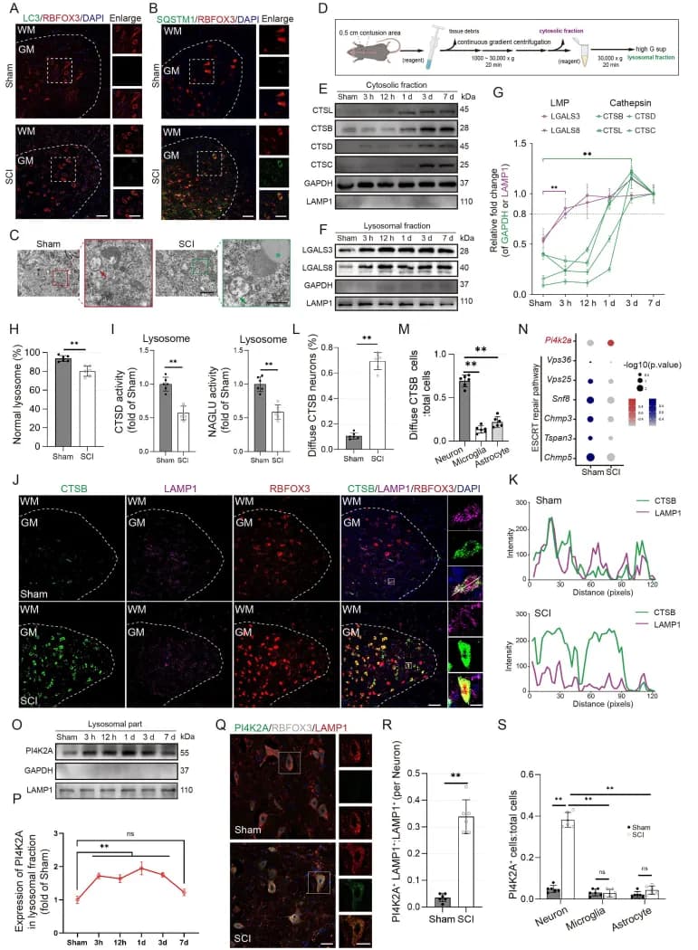 为明确 SCI 后神经元的核心损伤表型,本研究率先检测自噬 - 溶酶体系统功能状态,结果显示 SCI 后神经元自噬流受阻,且出现溶酶体膜通透化(LMP),该损伤呈神经元特异性,远高于其他神经细胞(图 1A,B,C,E,H,J-M)。基于溶酶体损伤后存在内源性修复通路的背景,通过 DEGs 分析发现经典 ESCRT 修复通路下调,而 PITT 通路关键分子 PI4K2A 在 SCI 后于神经元溶酶体中呈时间依赖性上调(图 1N-S),这一结果提示 PI4K2A 可能是介导 SCI 后神经元溶酶体修复的关键内源性因子,为后续探究其功能与机制奠定核心方向。