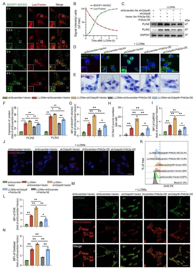 基于 Fig1 中 SCI 后神经元脂滴沉积的表型,结合溶酶体在脂质代谢中的核心作用,本研究进一步验证了 LMP 与神经元脂滴积累呈时间依赖性正相关,溶酶体损伤是脂滴异常沉积的重要上游诱因(图 5A,B)。而借助 OSBPL6 敲低实验,证实 PI4K2A-OSBPL6 轴可通过修复溶酶体,显著减少 LMP 诱导的神经元脂滴沉积,并进一步缓解脂质过氧化与活性氧的异常产生,且该效应完全依赖 OSBPL6(图 5C-H,I-N)。该结果将 PI4K2A-OSBPL6 轴的功能从溶酶体修复延伸至神经元脂质稳态调控,揭示了该通路可通过双重作用缓解神经元脂毒性。