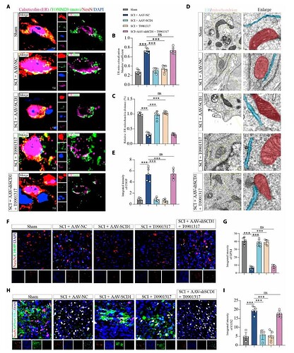 为了确认 LXRα-SCD1 通路是否可以作为 SCI 潜在治疗靶点,研究者在 SCI 小鼠模型中进行干预实验。实验分为治疗组(AAV-SCD1 过表达或给予 LXRα 激动剂 T0901317)、SCD1 敲低组 和对照组。结果显示,治疗组神经元的内质网-线粒体距离恢复正常,线粒体嵴结构完整(图4 A-D),然而,当 SCD1 被沉默,T0901317 的保护作用显著削弱。类似地,体外实验也验证了这一结果,同时伴随 MUFA 水平恢复,脂质过氧化和铁死亡被显著抑制 (图5)。