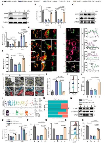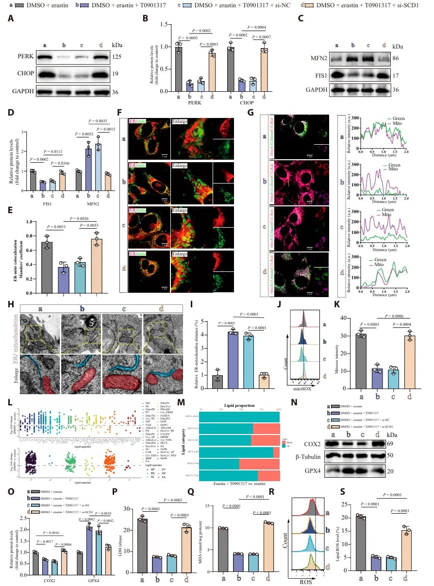 为了确认 LXRα-SCD1 通路的作用, 研究者通过共聚焦成像和透射电镜观察 SCI 后神经元的亚细胞特征,发现 SCI 显著增加了 ERMCS 的形成。同时,SCD1 的缺失会导致 ERMCS 的异常扩展(图3 A-F)。这种 “过度接触” 使脂质过氧化物大量从内质网转运到线粒体,进而引发线粒体损伤和铁死亡(图3 G-R)。