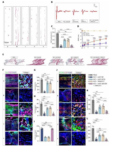 为了进一步评估该干预策略能否显著恢复 SCI 小鼠的运动功能,研究者进行了行为学评分和电生理实验。后肢足迹分析显示,治疗组小鼠步态显著改善,展现出清晰、规律的后肢脚印,步幅(Stride length)和步宽显著改善(图6 A)。电位检测(MEP)显示治疗组小鼠的 MEP 波幅显著回升、潜伏期缩短(图6 B-C)。