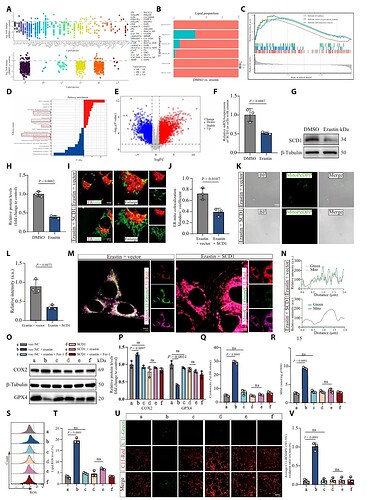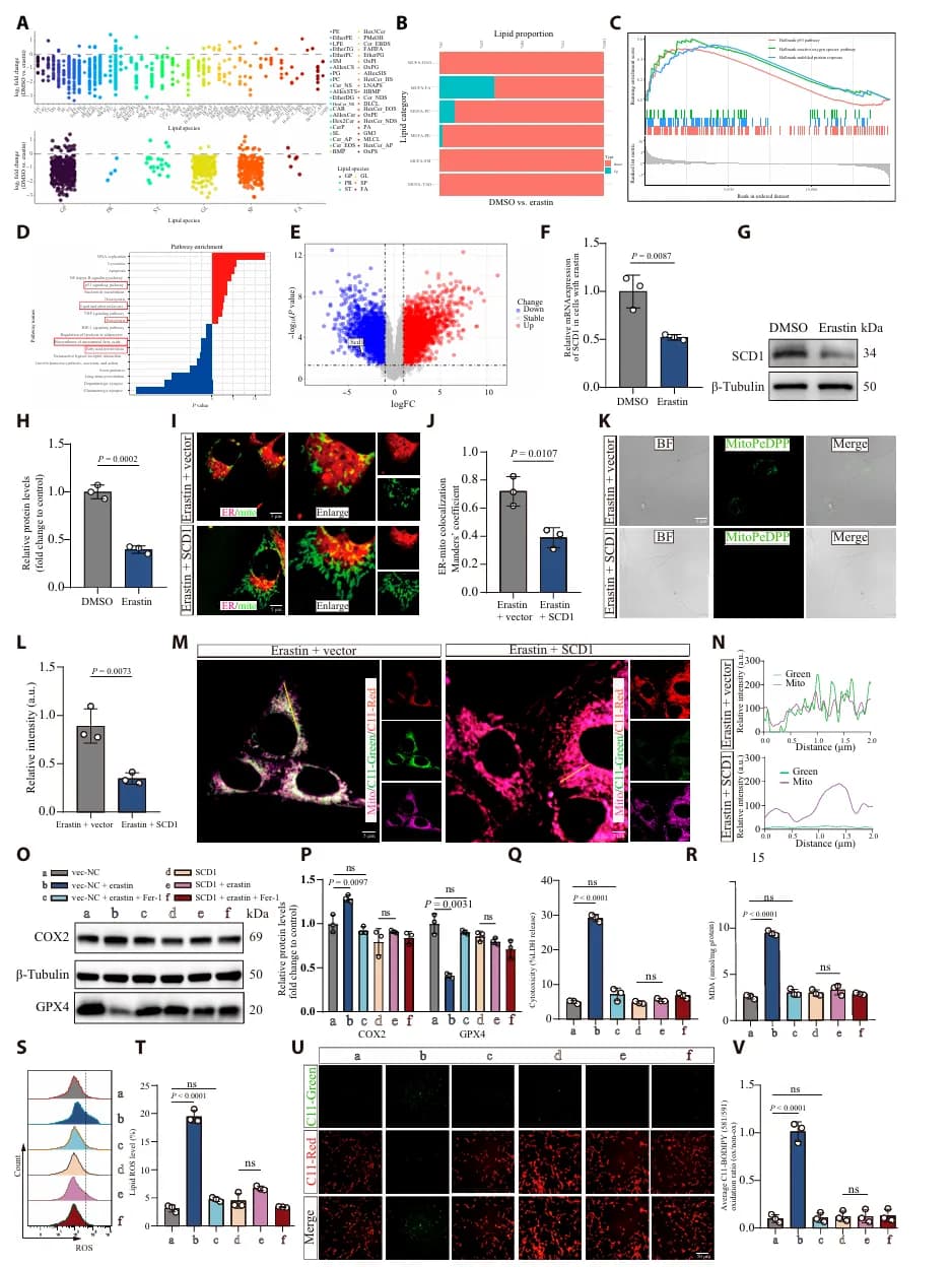 为了研究 SCI 后神经元铁死亡背后的分子机制,研究者通过分析 HT22 细胞在 Erastin(铁死亡诱导剂)处理后的转录组数据,发现 SCD1 显著下调(图1 F-G)。SCD1 负责合成单不饱和脂肪酸(MUFAs),其缺乏导致脂质代谢失衡,同时伴随包括 ROS、未折叠蛋白反应和 p53 信号在内的氧化应激通路激活(图 1A-E)。相反,恢复 SCD1 表达能有效保护线粒体功能,减轻神经元铁死亡(图1 I-V)。