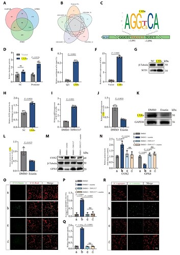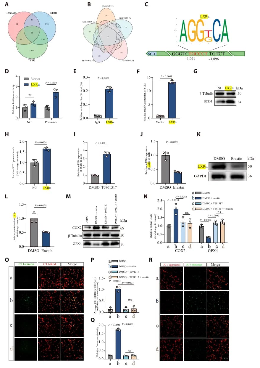 进一步的转录因子预测与生化实验结合发现,LXRα 是直接结合 SCD1 启动子并激活其转录的关键因子(图2 A-H)。LXRα 通过直接上调 SCD1 表达,进而减轻脂质过氧化和铁死亡的进程(图2 I-R)。此外,LXRα 敲低会加剧细胞铁死亡。这些发现明确了 LXRα-SCD1 通路在维持脂质稳态和抵抗铁死亡中的重要作用。