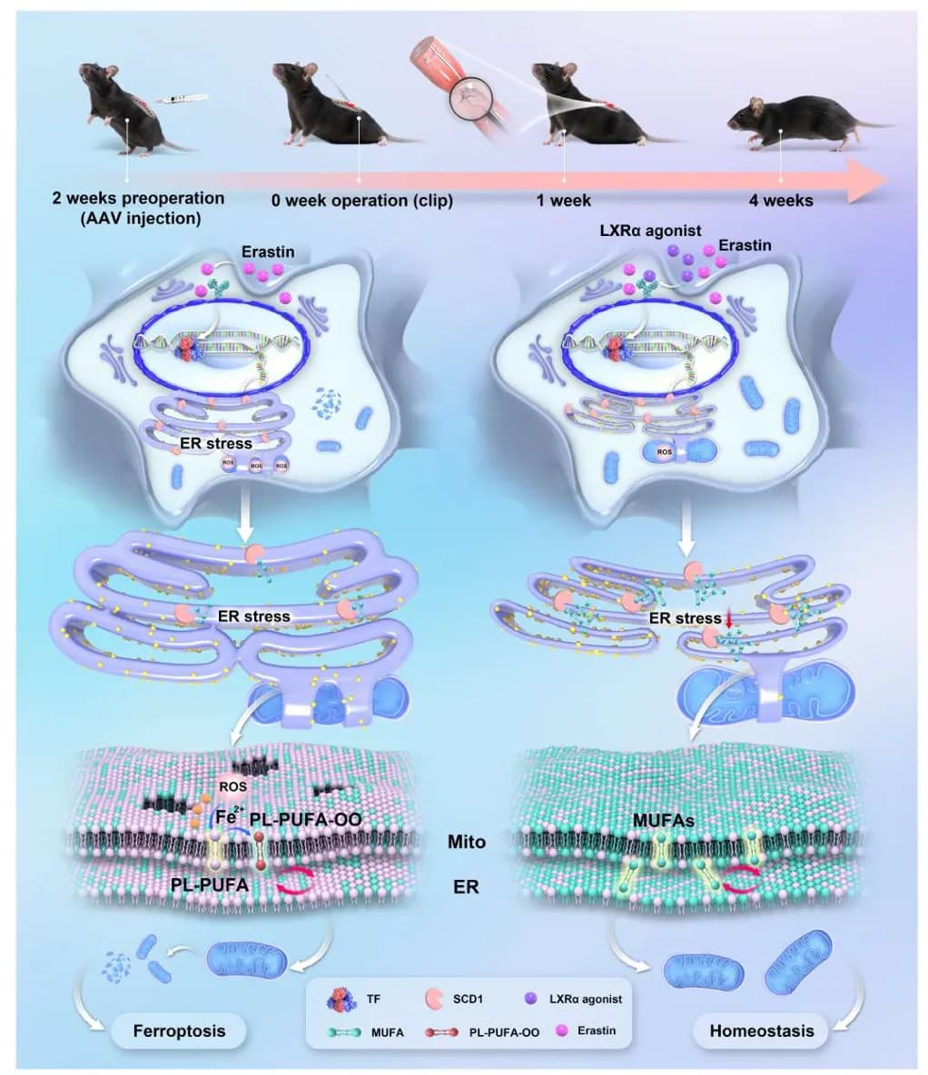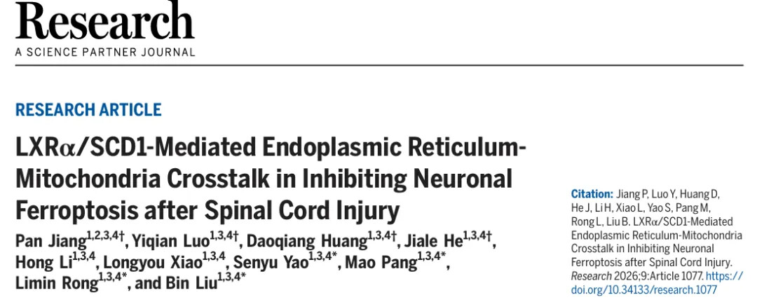 Jiang P, Luo Y, Huang D, He J, Li H, Xiao L, Yao S, Pang M, Rong L, Liu B. LXRα/SCD1-Mediated Endoplasmic Reticulum-Mitochondria Crosstalk in Inhibiting Neuronal Ferroptosis after Spinal Cord Injury. Research . 2026;9:1077. DOI: 10.34133/research.1077