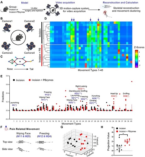 为更全面、客观地评估自发性疼痛与情绪相关行为改变,研究者采用 BehaviorAtlas 3D-AI 动物行为分析系统,对术后小鼠进行无偏、精细化行为量化(图 4A)。该系统通过四机位相机采集 16 个解剖学锚点轨迹,完成三维重建与行为聚类分析(图 4B–C),共识别 40 种运动类型(图 4D)。结果显示,与切口组相比,PBzymes 处理组小鼠擦脸、僵直等疼痛样行为占比显著降低,扑跃、攀爬、弓背等焦虑样行为也明显减少(图 4E–F)。降维分析与 X 轴投影进一步证实,PBzymes 组运动模式更接近正常生理状态,从全行为谱层面验证其对术后疼痛相关异常行为的改善作用(图 4G–H)。