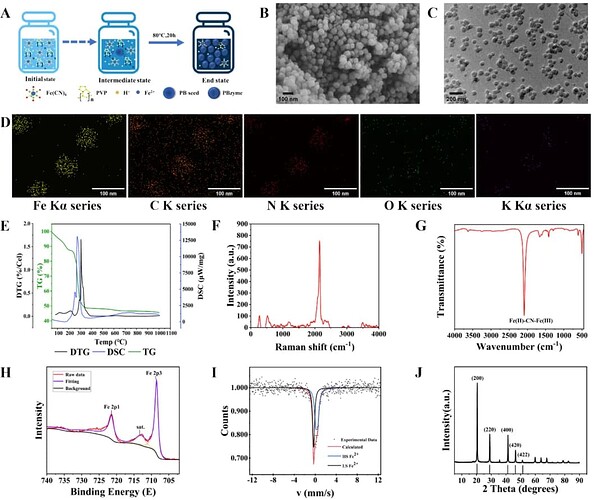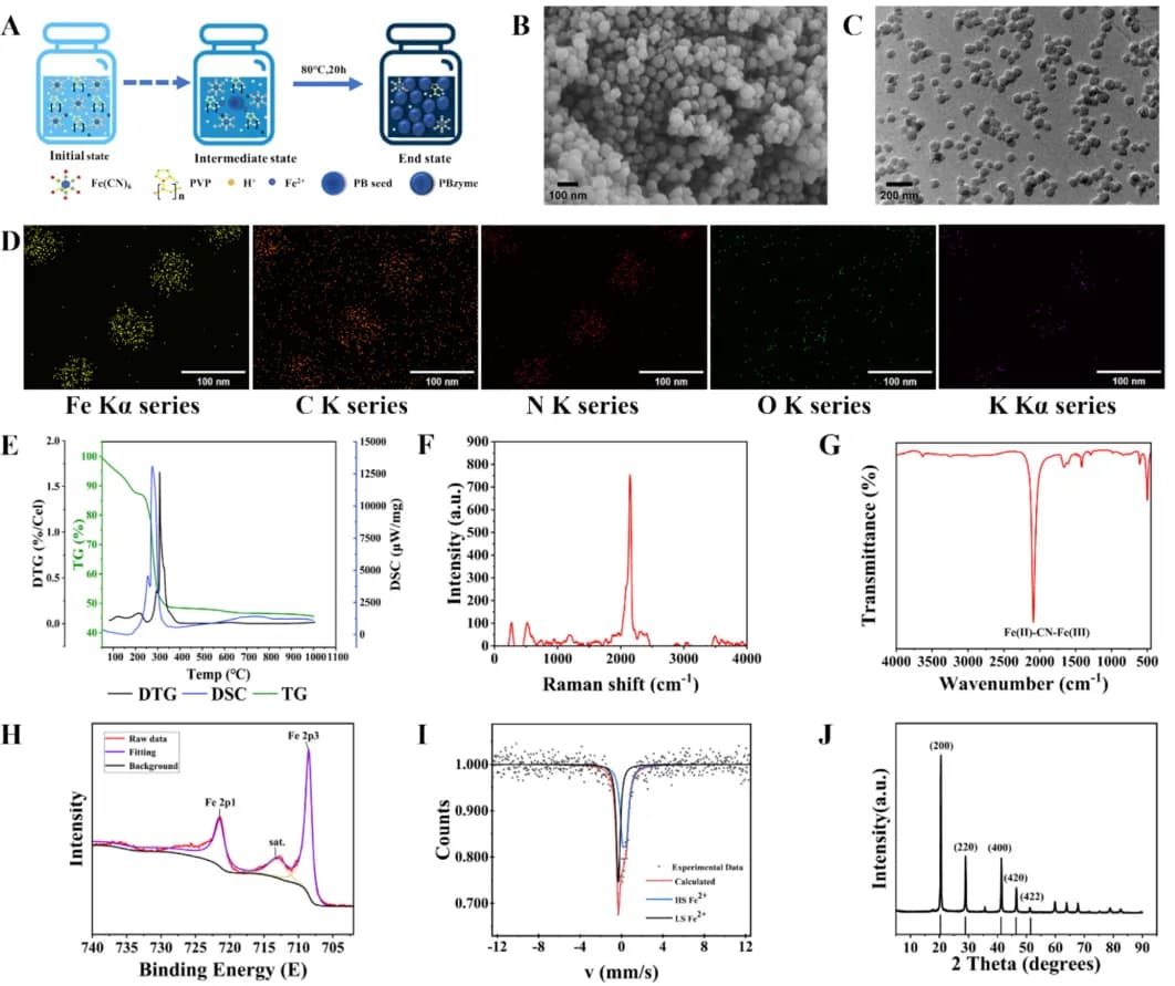 扫描电镜与透射电镜结果显示,所制备的 PBzymes 呈球形、大小均一、分散性优异(图 2B–C)。元素 mapping 证实 Fe、K、C、N、O 在颗粒内部分布均匀(图 2D)。热重分析、拉曼光谱、红外光谱、X 射线光电子能谱、穆斯堡尔谱与 X 射线衍射结果共同证明,PBzymes 具有标准普鲁士蓝晶体结构,理化性质稳定、结晶度良好(图 2E–J)。上述结果表明,本研究成功合成结构均一、性质稳定、符合生物医学应用要求的 PBzymes,为后续体内外实验奠定材料基础。