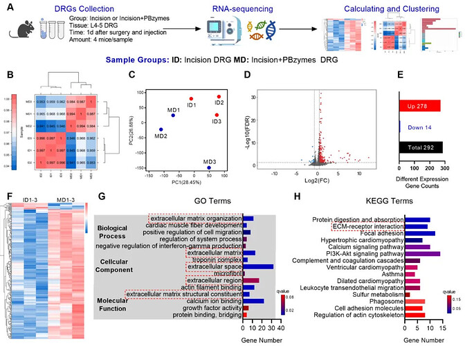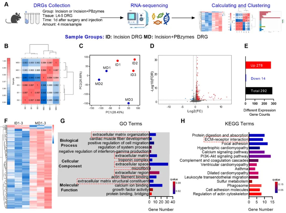 为挖掘 PBzymes 镇痛的分子机制,研究者对术后 1 天小鼠 L4–L5 DRG 组织进行转录组测序(图 5A)。样本相关性与主成分分析显示,切口组与 PBzymes 处理组基因表达谱存在显著差异,提示 PBzymes 可显著调控 DRG 基因表达(图 5B–C)。分析共鉴定到 292 个差异基因,GO 与 KEGG 富集分析一致表明,差异基因高度富集于细胞外基质(ECM)相关通路,提示 PBzymes 可能通过调节 DRG 微环境发挥作用(图 5G–H)。