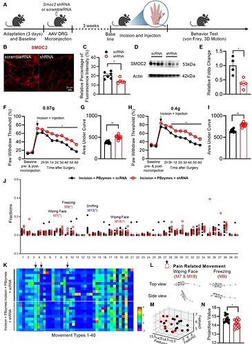为验证 SMOC2 是 PBzymes 镇痛的必需靶点,研究采用 AAV 介导 shRNA 在 DRG 特异性敲低 Smoc2(图 8A)。免疫荧光与 Western blot 证实 SMOC2 表达被显著下调,敲低效率可靠(图 8B–E)。行为学结果显示,SMOC2 敲低可完全逆转 PBzymes 对机械性痛觉超敏的缓解作用,缩足频率恢复至切口组水平,证实镇痛效应依赖 SMOC2(图 8F–I)。3D 运动捕捉分析显示,SMOC2 敲低后疼痛相关行为占比显著回升,运动模式重新呈现疼痛异常特征(图 8J–N)。结合外源性 SMOC2 可复刻镇痛效应的补充实验,该部分结果证明 SMOC2 是 PBzymes 发挥镇痛作用的必要且充分靶点。