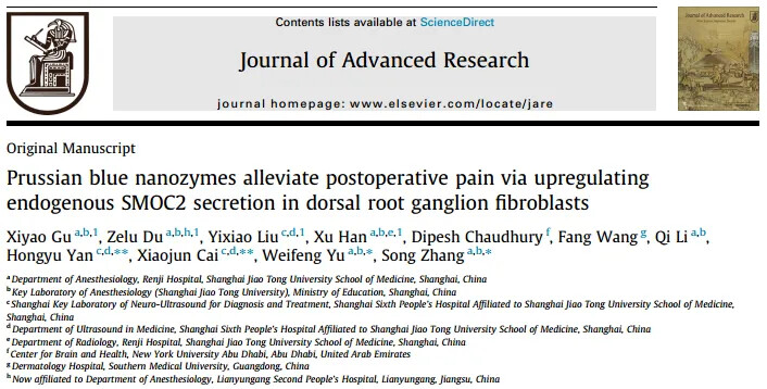Gu X, Du Z, Liu Y, Han X, Chaudhury D, Wang F, Li Q, Yan H, Cai X, Yu W, Zhang S. Prussian blue nanozymes alleviate postoperative pain via upregulating endogenous SMOC2 secretion in dorsal root ganglion fibroblasts. J Adv Res. 2026 Feb 18:S2090-1232(26)00177-3. doi: 10.1016/j.jare.2026.02.045. Epub ahead of print. PMID: 41720157.
